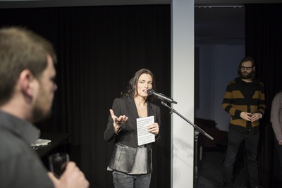 AusstellungseröffnungEs sprechen Verena Konrad, Direktorin vai und Bernardo Bader, Architekt.