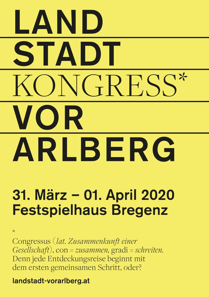 Von 31. März bis 1. April 2020 findet im Festspielhaus Bregenz der Kongress LandStadt-Vorarlberg statt und geht auf Entdeckungsreise rund um das Spannungsfeld Stadt und Land. In verschiedenen Formaten mit Inputs zu den Prozessen von Urbanisierung und Suburbanisierung und gegenseitigem Austausch werden Kooperationsmöglichkeiten zwischen Akteur|innen erkundet, die sich hier engagieren und diese Prozesse reflektieren und begleiten.